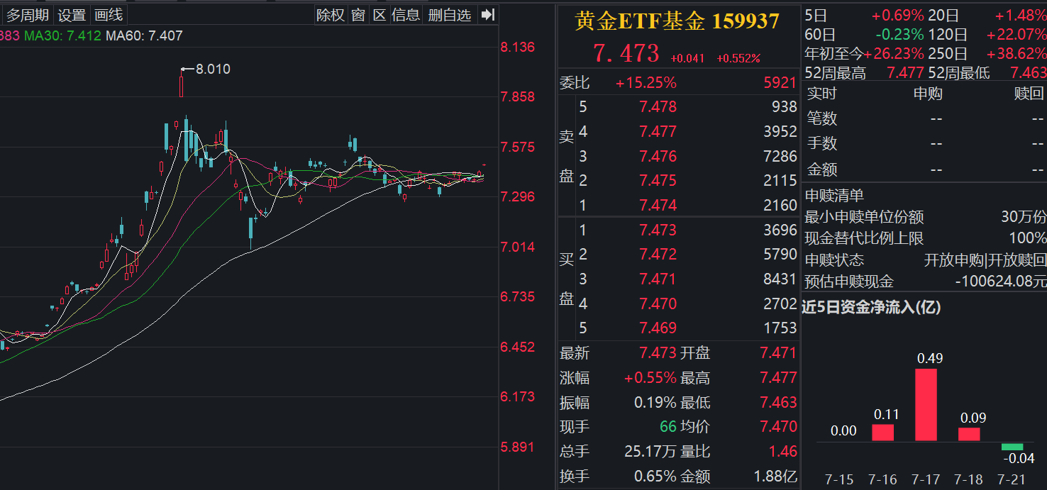 7月22日(周二),截至10:40,黄金ETF基金(159937)上涨0.55%,最新报价7.47元,成交额1.88亿元。]article_adlist_manual-->