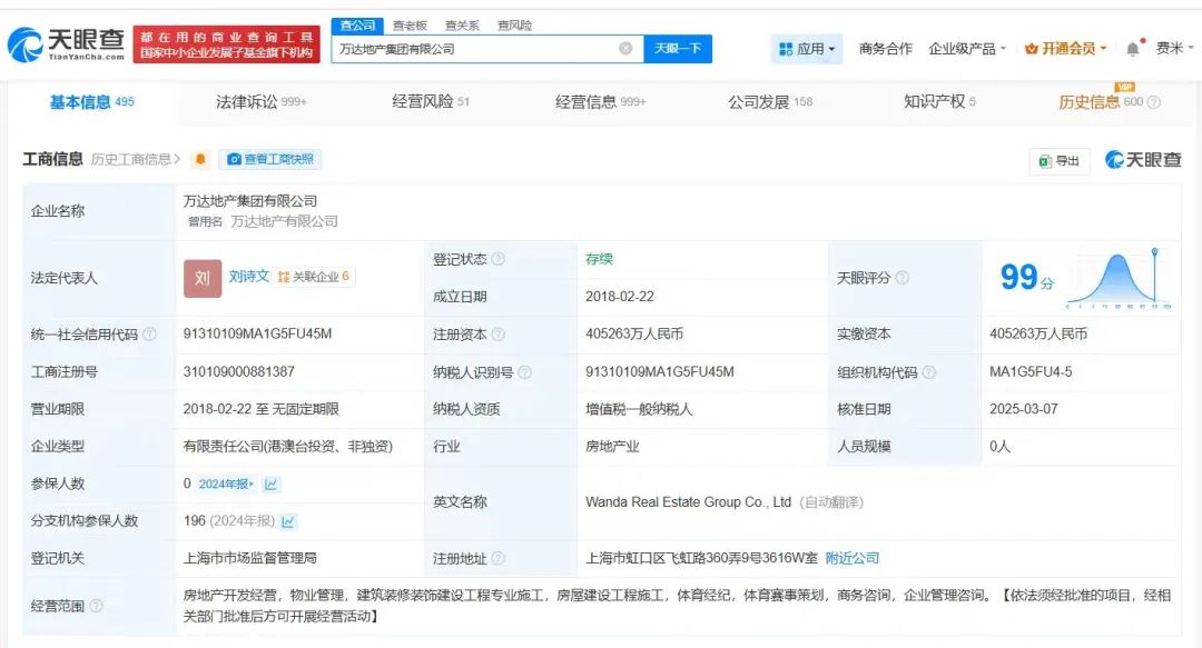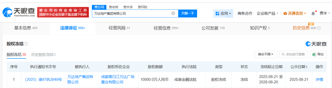 天眼查天眼风险信息显示,近日,万达地产集团有限公司新增一则股权冻结信息,股权所在企业为成都青白江万达广场置业有限公司,冻结股权数额1亿人民币,冻结期限为3年,执行法院为成渝金融法院。成都青白江万达广场置业有限公司成立于2019年5月,法定代表人为甯佐夫,注册资本1亿人民币,经营范围为房地产开发经营。股东信息显示,该公司由万达地产集团有限公司全资持股。